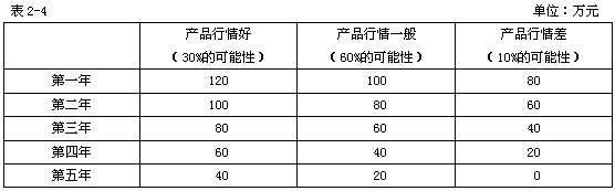 【例4】沿用【例3】,假定利用甲固定资产生产的产品受市场行情波动影响大,企业预计未来5年每年的现金流量情况如表2-4所示。