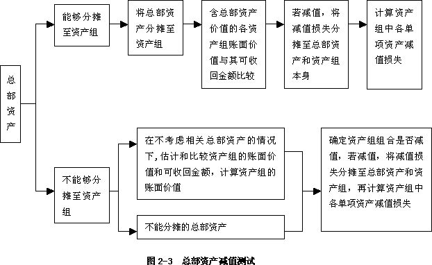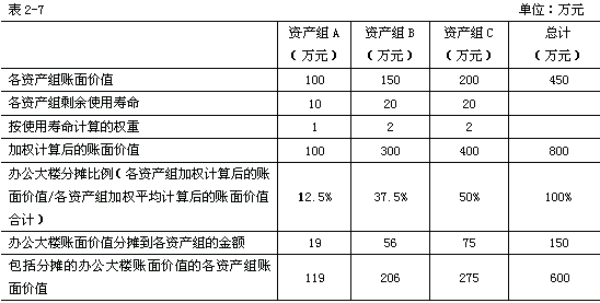 本例中,在对各资产组进行减值测试时,首先应当认定与其相关的总部资产。由于ABC公司的经营管理活动由总部负责,因此相关的总部资产包括办公大楼和研发中心,考虑到办公大楼的账面价值可以在合理和一致的基础上分摊至各资产组,但是研发中心的账面价值难以在合理和一致的基础上分摊至各相关资产组。因此,对于办公大楼的账面价值,企业应当首先根据各资产组的账面价值和剩余使用年限加权平均计算的账面价值分摊比例进行分摊,具体如表2-7所示: